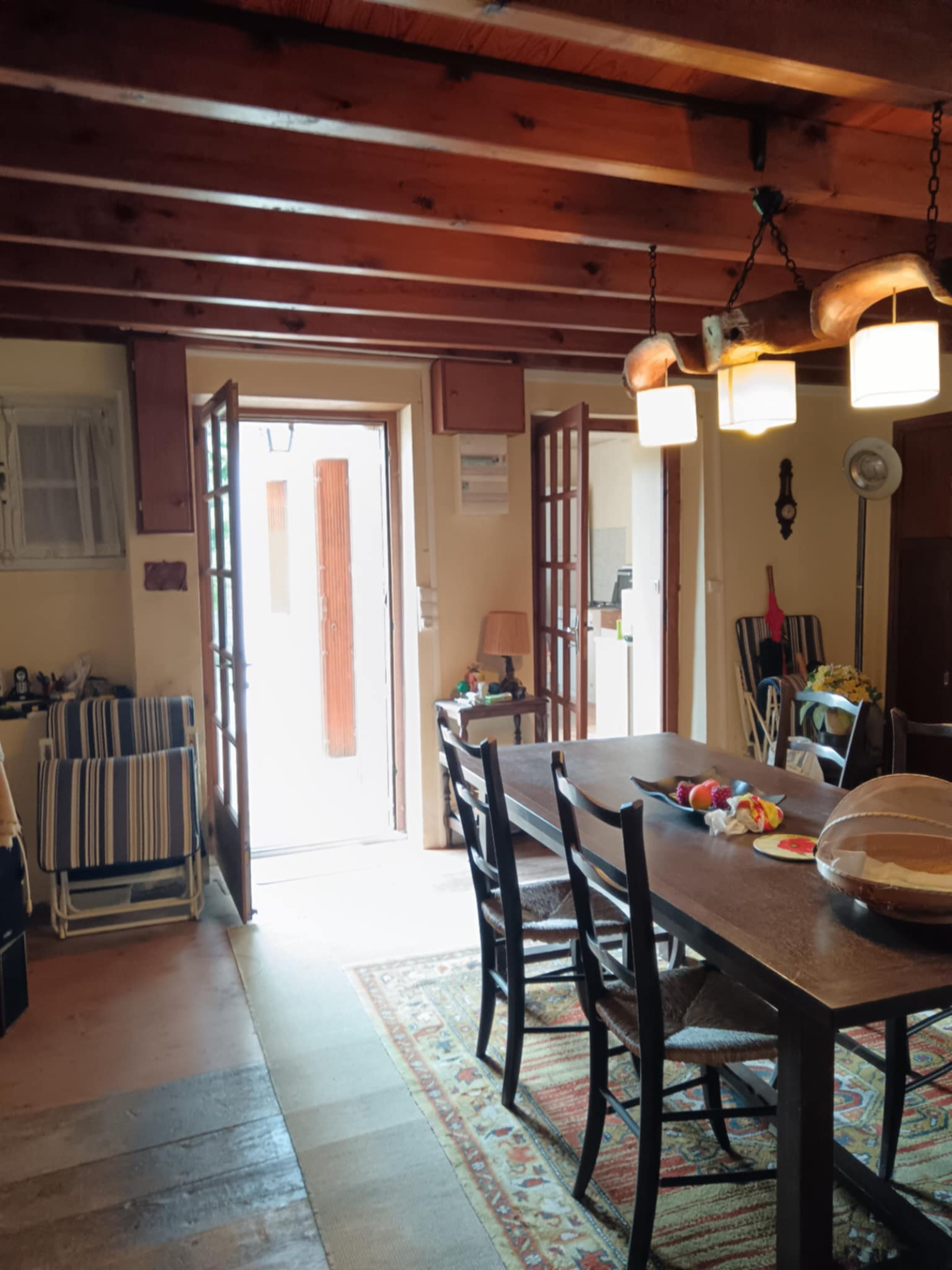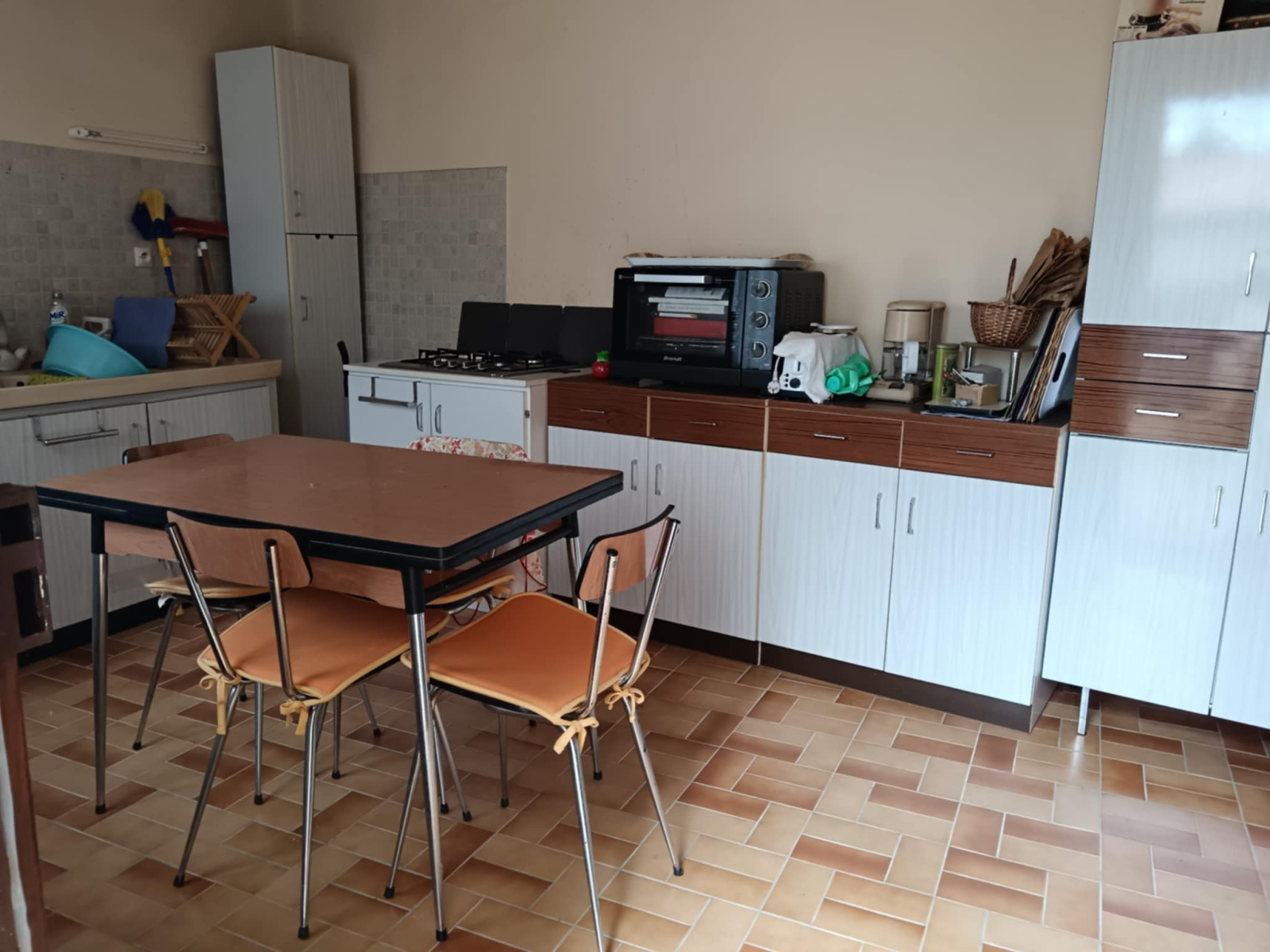 cuisine simple, séjour avec poêle, salle d'eau, wc