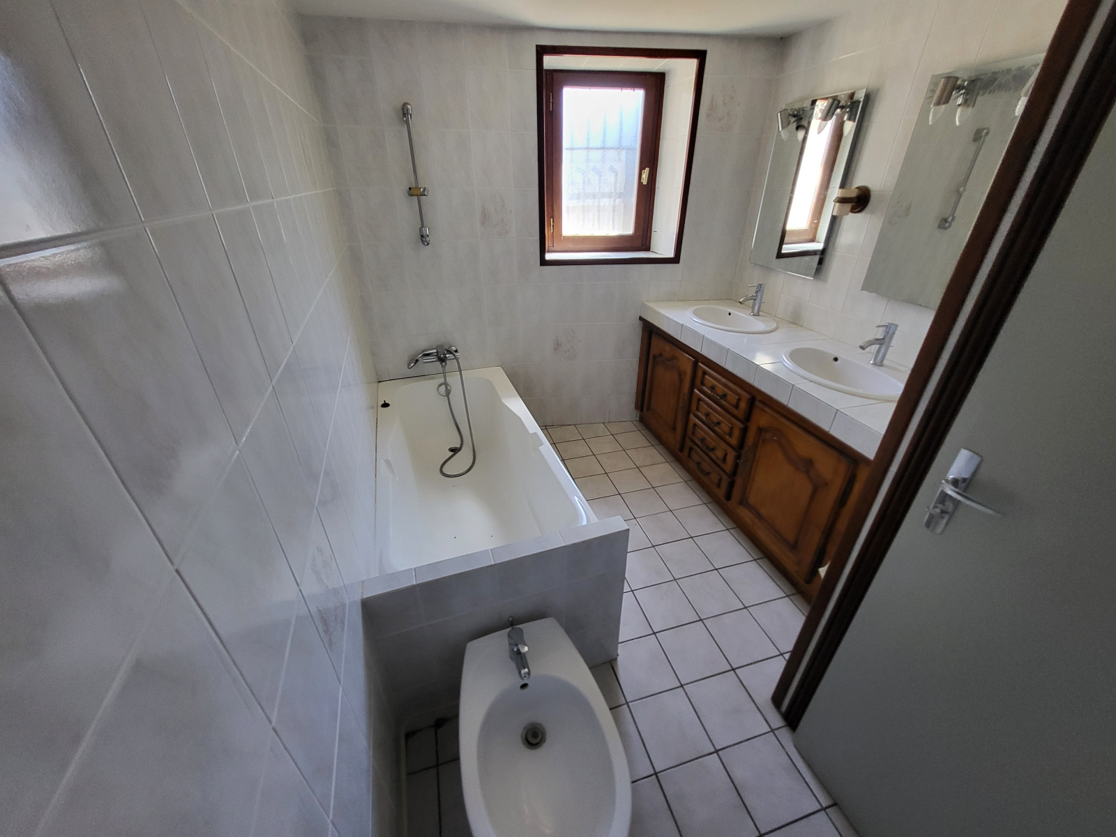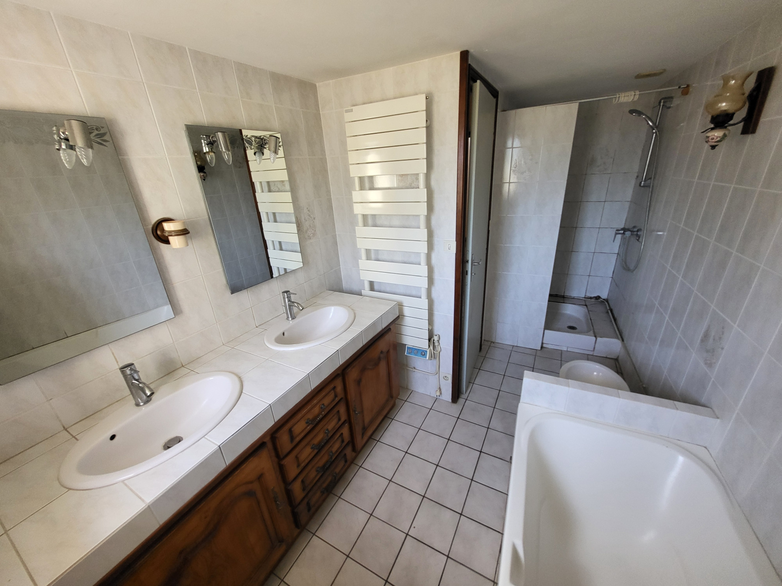 Cuisine équipée, salon, salle à manger, wc, 2 chambres avec dressing, salle d'eau, salle de bains avec douche et baignoire, et double vasque, bidet et seche serviette mixte.