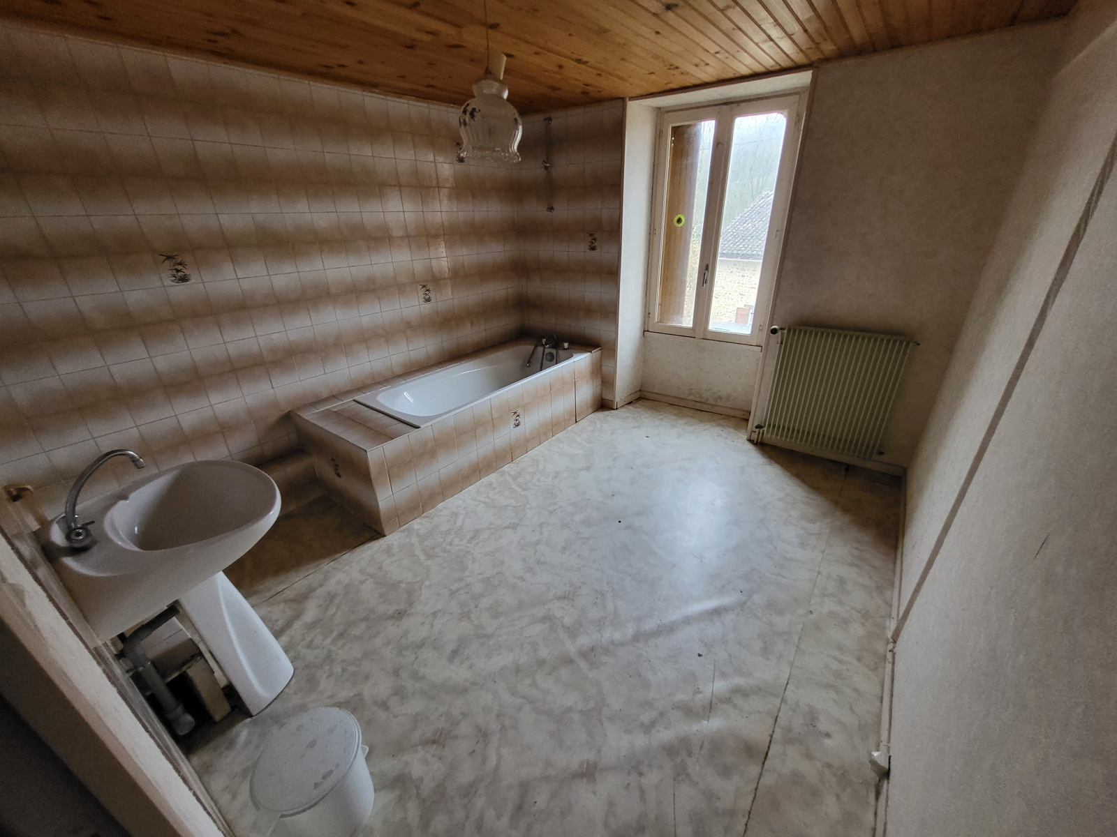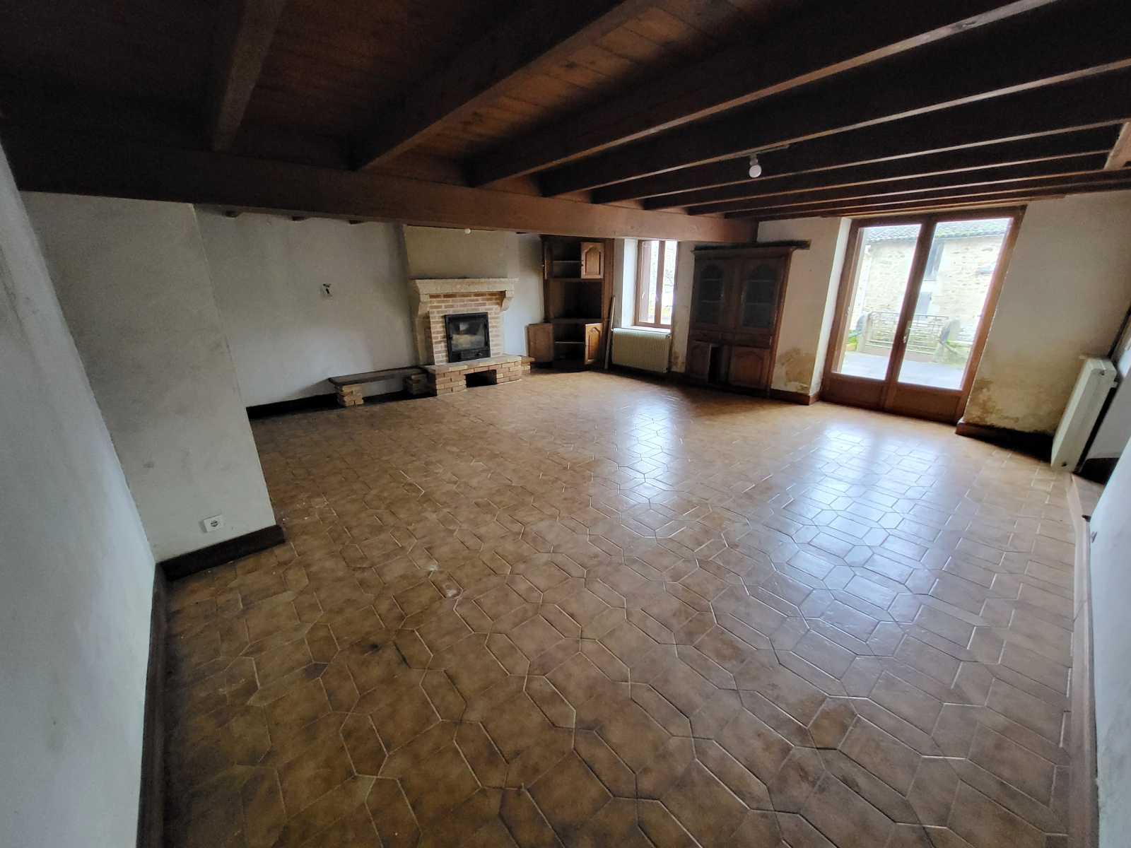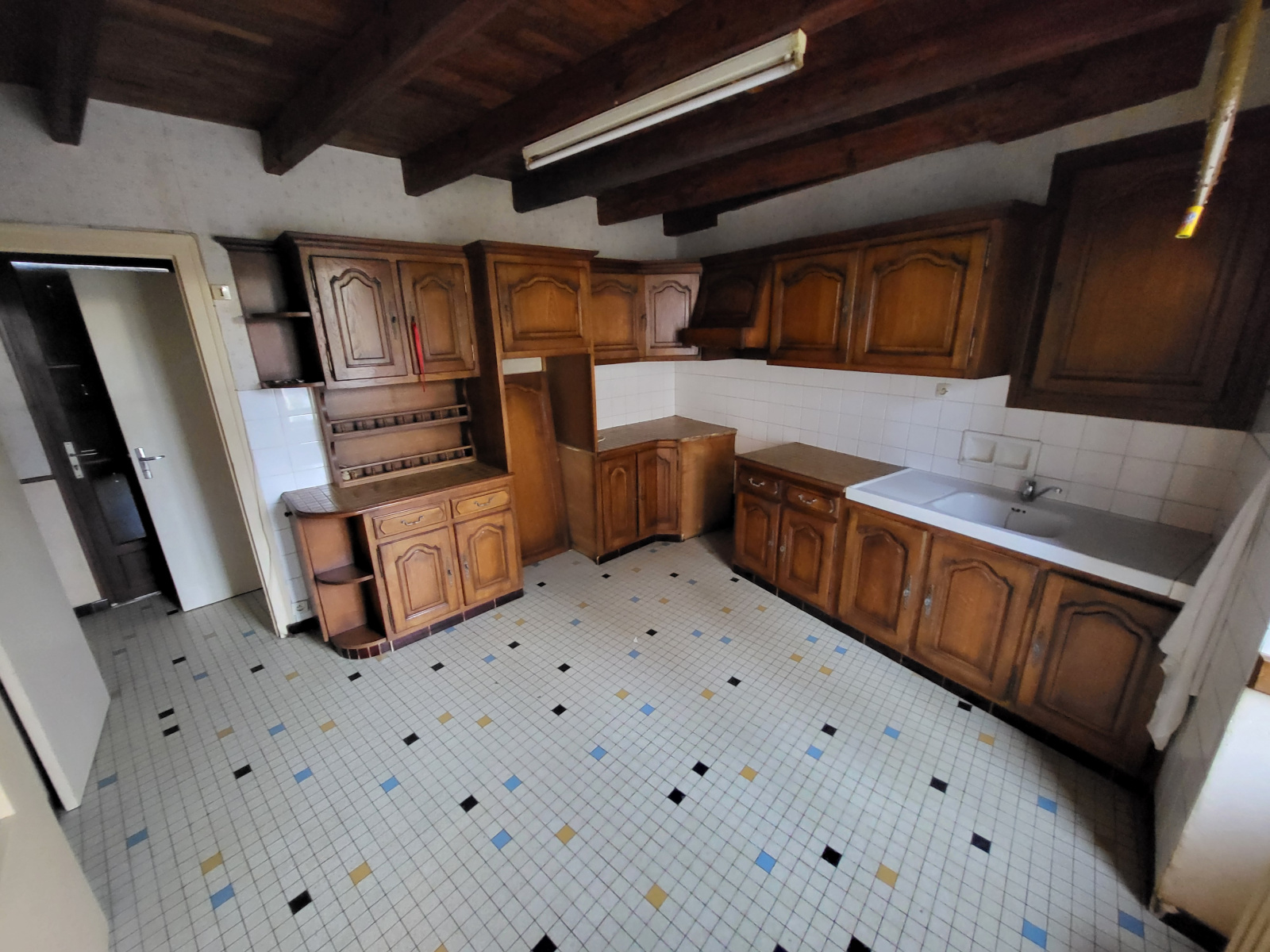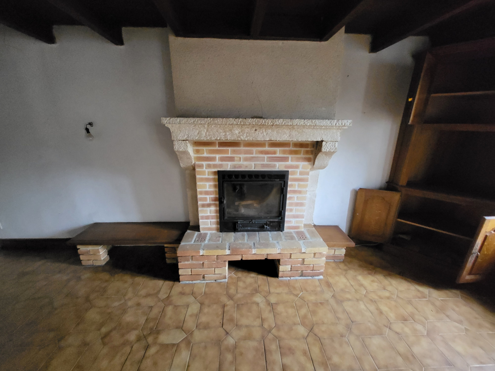 Entrée, cuisine meublée, ;salle d'eau, salon avec cheminée, salle à manger avec insert, salle d'eau, wc, cave, terrasse.