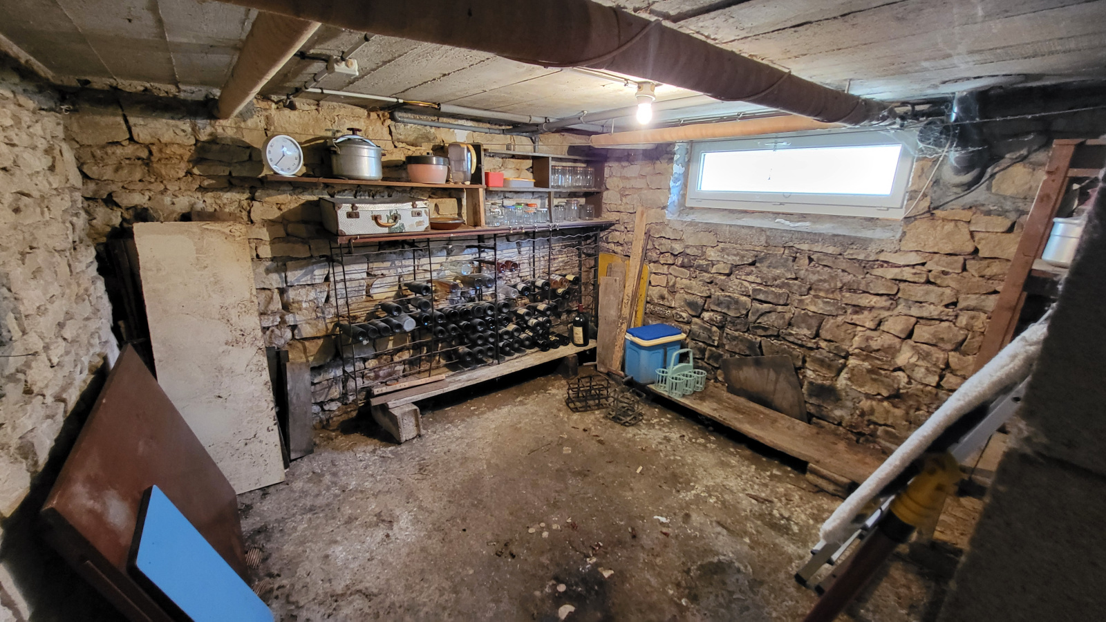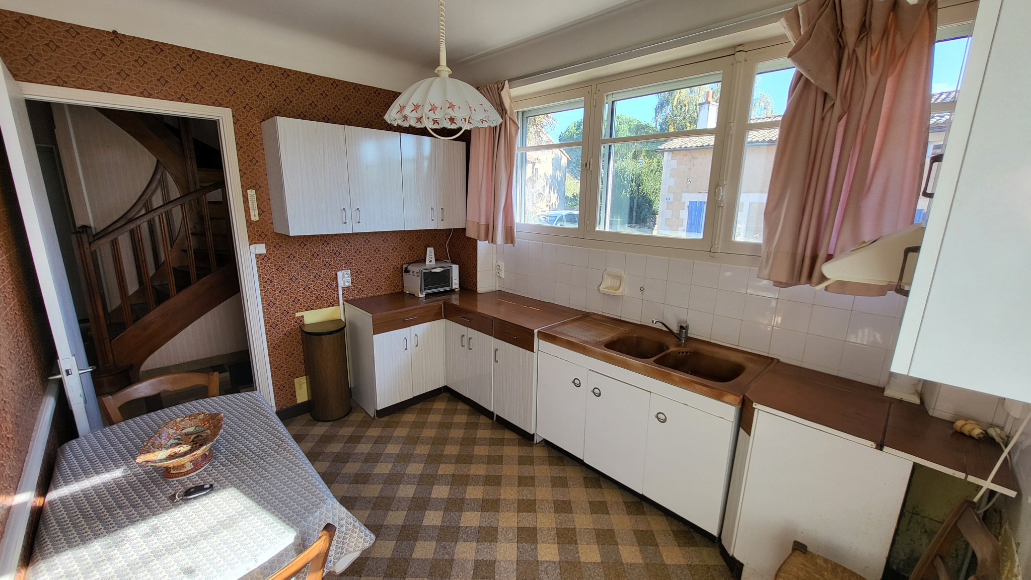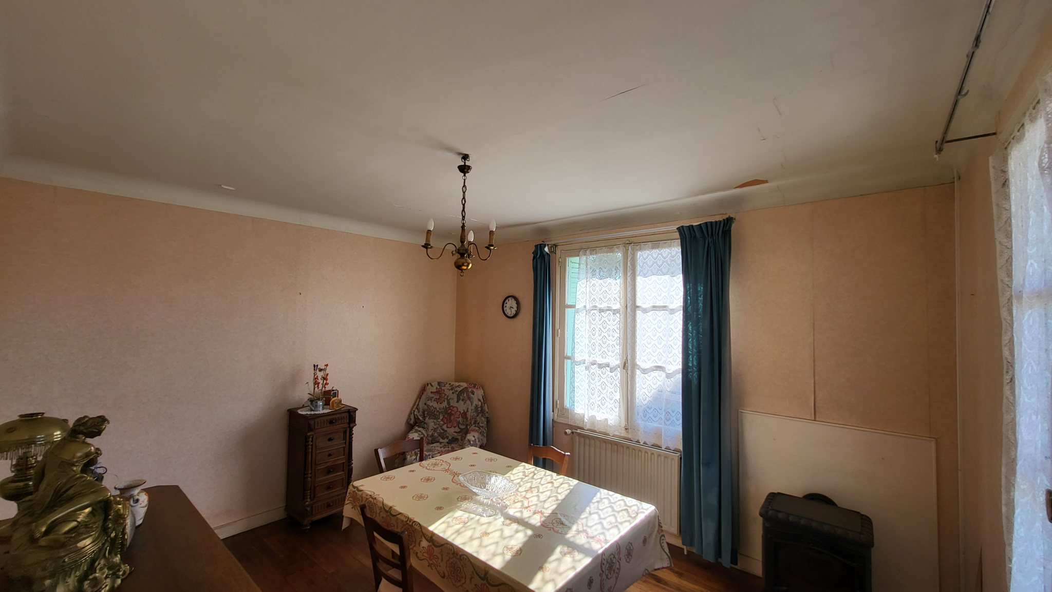 Entrée, cuisine meublée, salle à manger avec poêle à bois, salon, chambre, salle d'eau, wc.